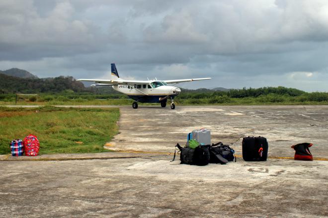 Der Flughafen, der sich am Festland befindet ist mit einer eher baufälligen Brücke mit der Insel-Ortschaft Playon Chico verbunden.